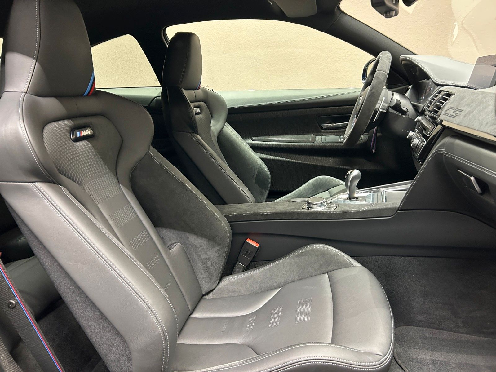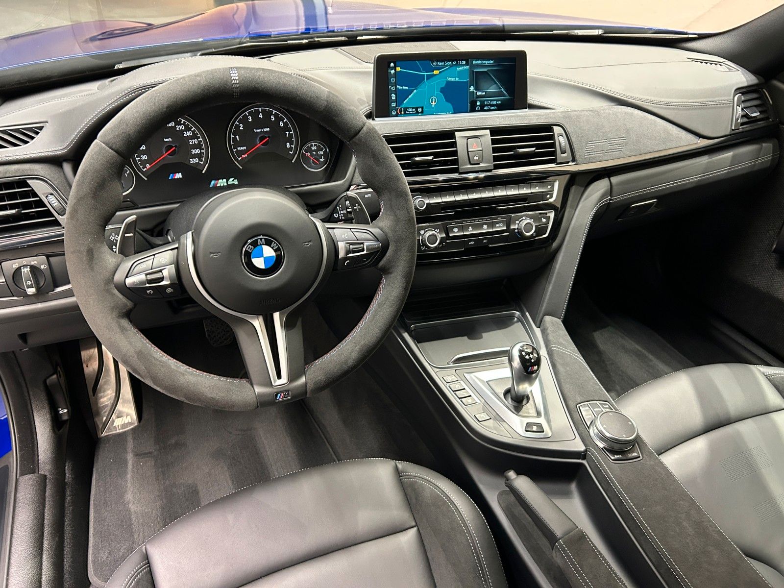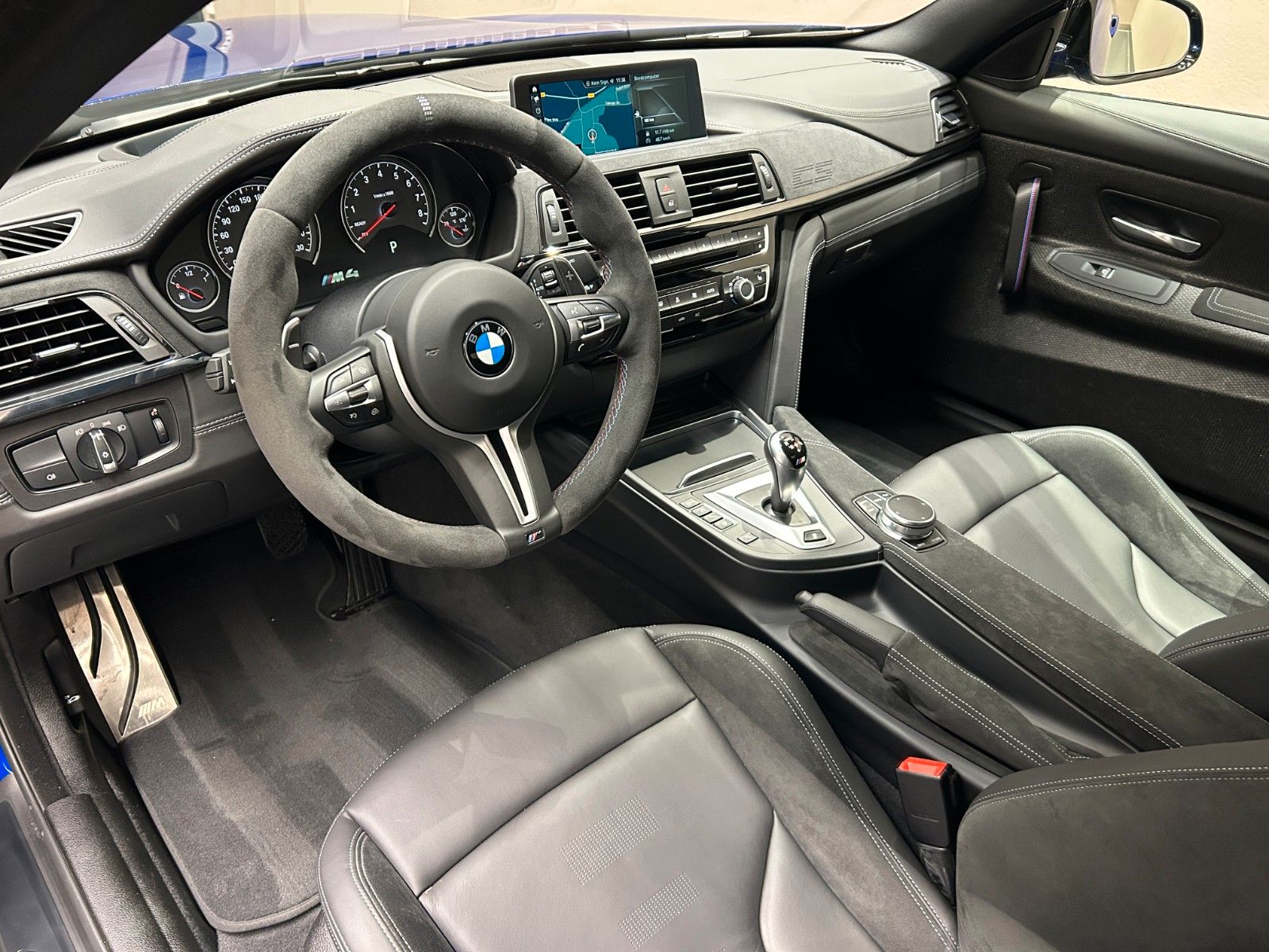 Im Innenraum erwarten Sie hochwertige schwarze Lederausstattung mit Sportsitzen, die elektrisch verstellbar sind und über eine Memory-Funktion verfügen. Das Sportpaket und die dynamische Fahrwerkskontrolle unterstreichen den sportlichen Charakter dieses M4.