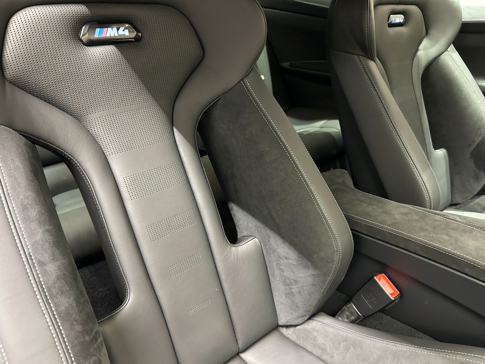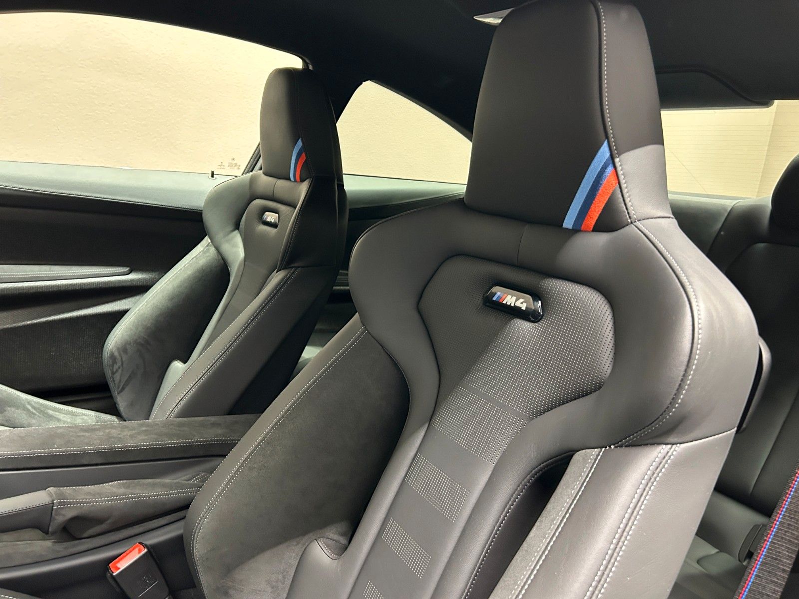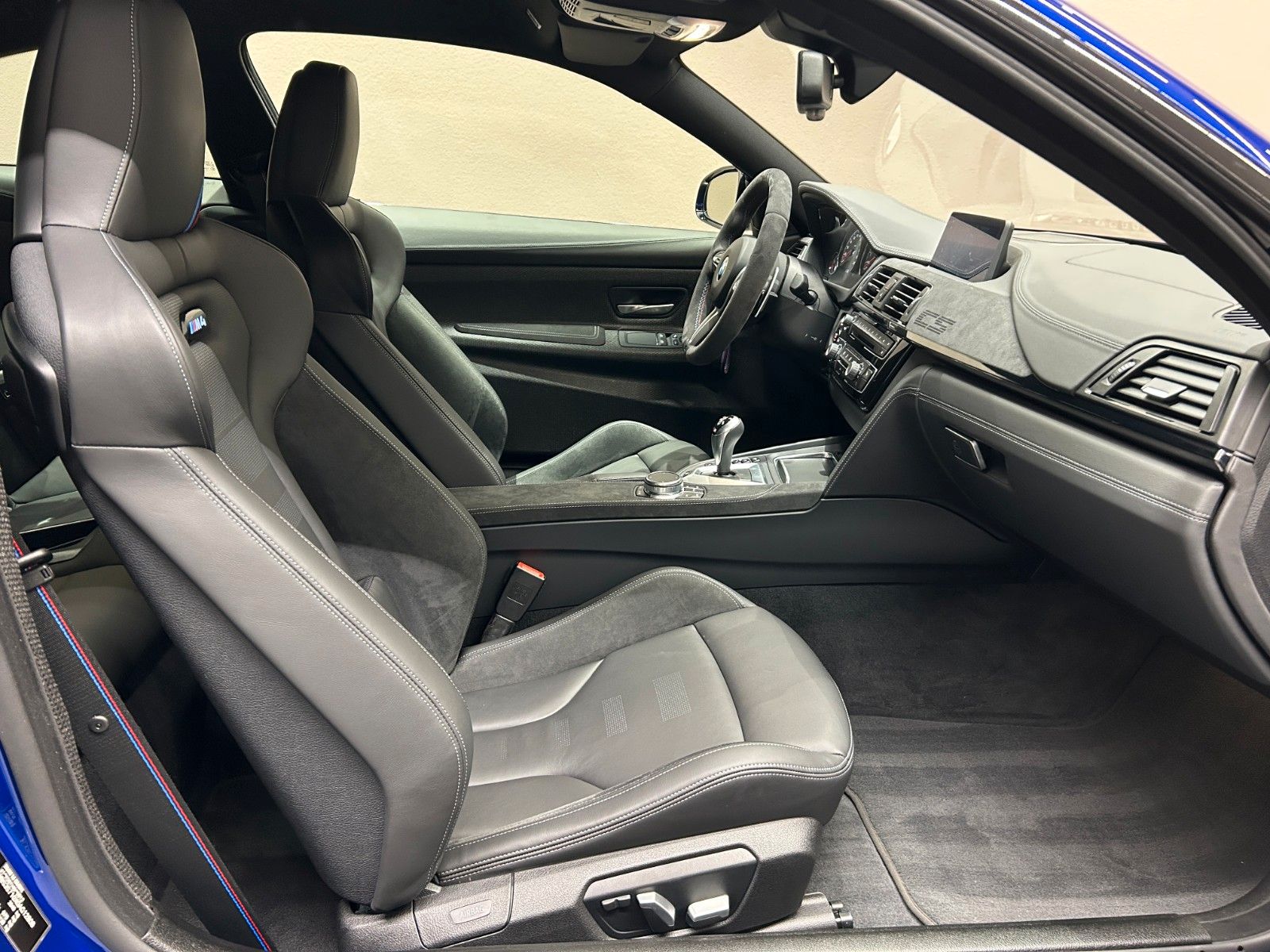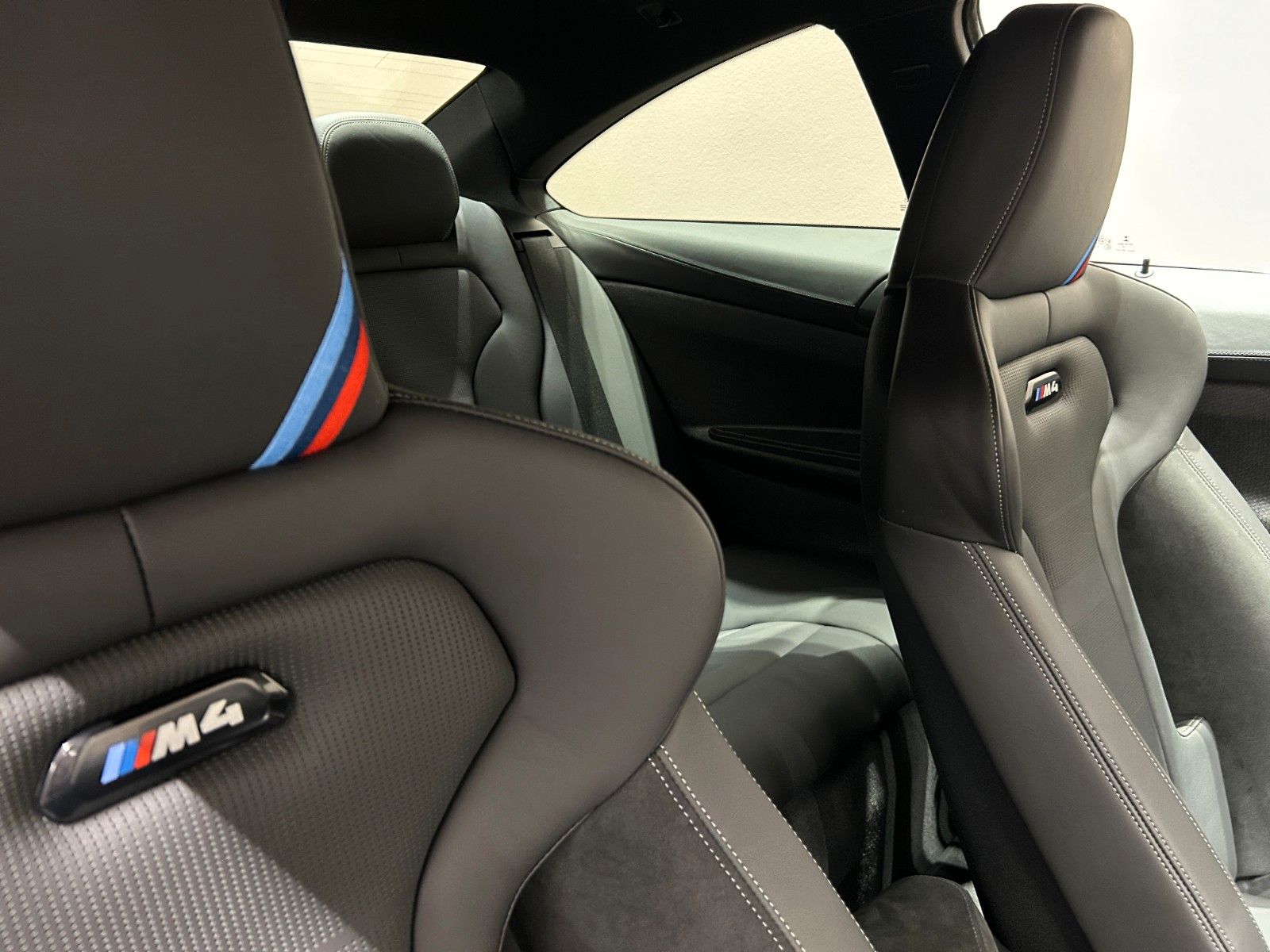 Im Innenraum erwarten Sie hochwertige schwarze Lederausstattung mit Sportsitzen, die elektrisch verstellbar sind und über eine Memory-Funktion verfügen. Das Sportpaket und die dynamische Fahrwerkskontrolle unterstreichen den sportlichen Charakter dieses M4.
